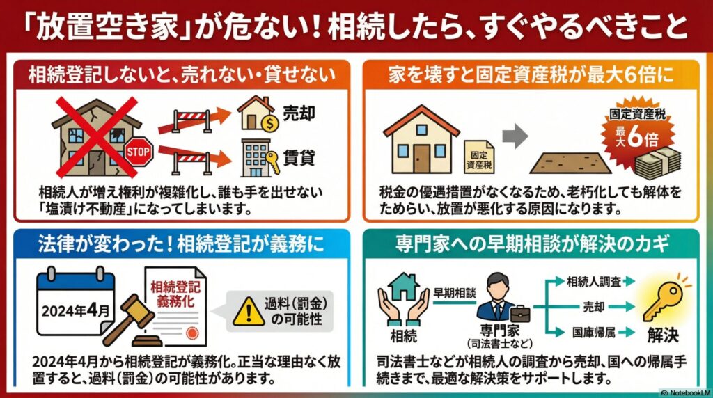 - 空き家問題は、放置すればするほど権利関係が複雑化し、状況が悪化します。
